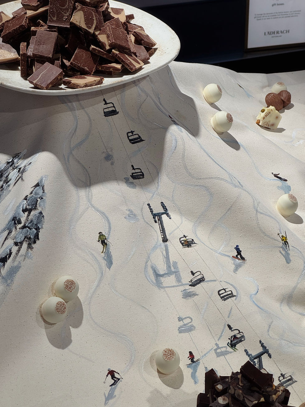 Using 'A Swiss Christmas' as the source of inspiration, Geraldine found that snow sports such as skiing and snowboarding formed the core bonding activity between family and friends during the winter festive season in Switzerland, where Läderach originated from. She conceptualized a 3-dimensional ski resort with 3 'peaks' as the main chocolate display areas, representing different ski slopes, and hand-painted skiers and snowboarders in the style of micro realism scattered around the chocolate landscape. Her intention was for the grazing table to be fun, whimsical, and interactive for diners, as opposed to a conventional seated dining table set up.