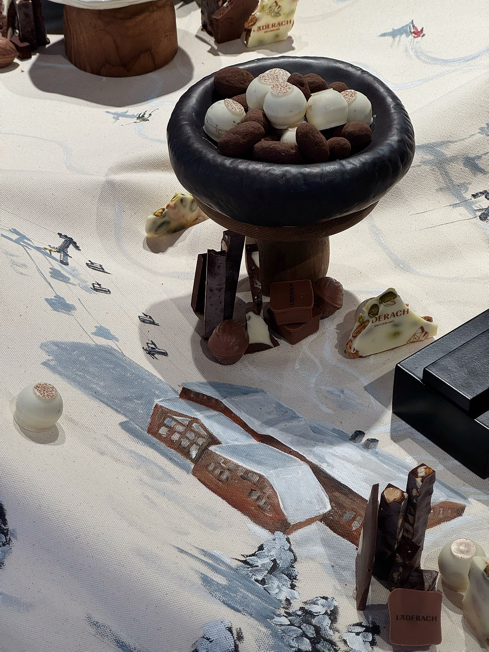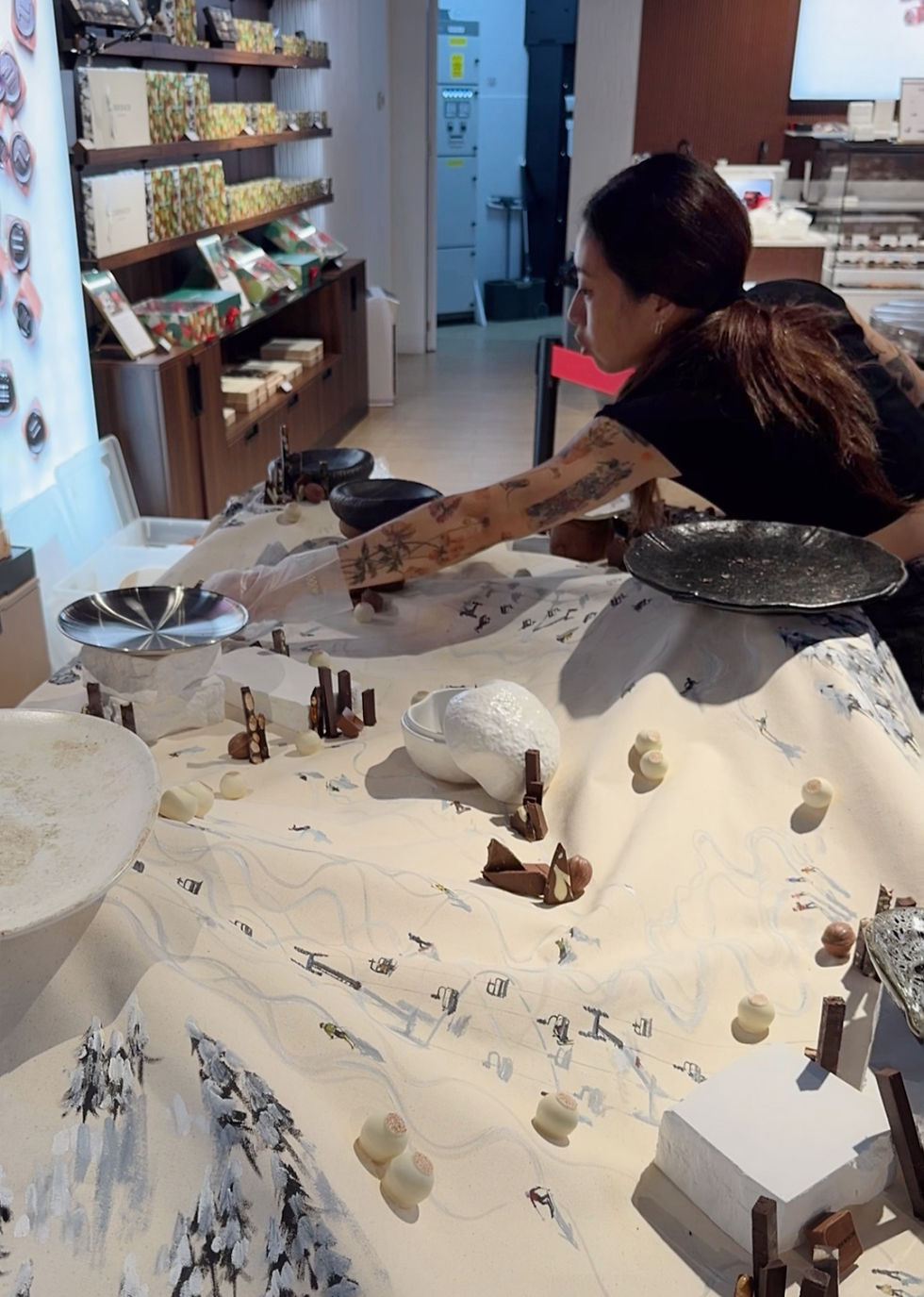 In collaboration with Läderach Singapore, Geraldine created a hand-painted table scape for an exclusive Läderach chocolate appreciation workshop held in December 2025. Designed as a unique Christmas experience for ION Orchard's VIP members, attendees were treated to an intimate sharing and chocolate sampling session with Läderach Singapore's founder, Rachel, conducted over a chocolate grazing table inspired by a winter ski resort.