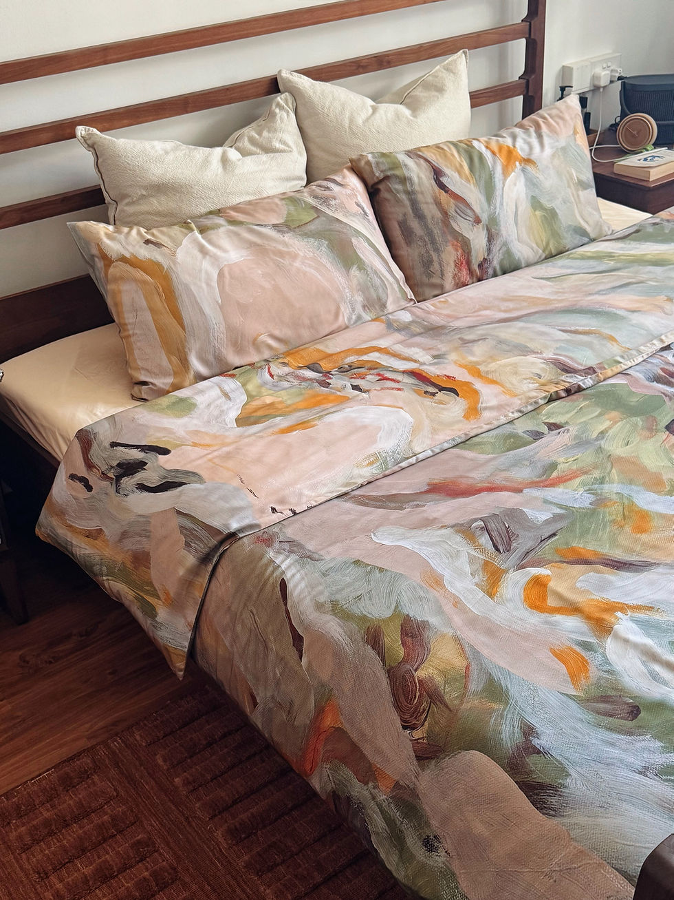 Her first foray into incorporating art on bedding, Geraldine collaborated with local bamboo bedding brand, Bedtribe, to create their first artist-collaboration bedding print. The process of designing, planning, and sampling was in the works in 2025, with the official product launch in January 2026